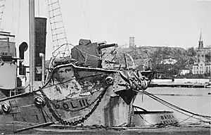 ![]() The ship Pol III in Tønsberg. The bow is damaged from ramming the German torpedo boat Albatros. | |||||||