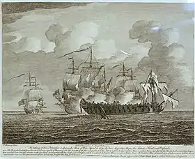 The British came up and found her to be the Princesa, carrying 64 guns and a crew of 650 under the command of Don Pablo Augustín de Gera.[4][5] They began to chase her at 10am, upon which she lowered the French colours she had been flying and hoisted Spanish ones. Mayne addressed his men saying 'When you received the pay of your country, you engaged yourselves to stand all dangers in her cause. Now is the trial; fight like men for you have no hope but in your courage.'[5] After a two and half hour chase the British were able to come alongside and exchange broadsides, which eventually left the Spanish ship disabled. The British then raked her until she struck her colours. The Spanish ship had casualties of 33 killed and around 100 wounded, while eight men were killed aboard Kent, another eight aboard Orford, and another one aboard Lenox.[4] Total British wounded amounted to 40, and included Captain Durell of Kent, who had one of his hands shot away.[4]