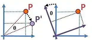 Note the equivalence between the two kinds of transformations: the coordinates of the new point in the active transformation and the new coordinates of the point in the passive transformation are the same, namely