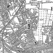 Facing the east of the common is St Michael and All Angels, Bedford Park; it and The Tabard Inn facing it across Bath Road, were built in 1880.[6][7] The 1894 Ordnance Survey map shows Acton Green bounded to the west by railway lines, and to the east by the boundary of Bedford Park; at that time, both the west of Bedford Park and the east of Acton Green consisted of orchards.[8]
