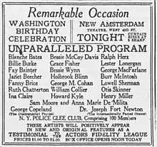 In October 1921 Fidelity began presenting monthly "concerts" to benefit its building fund.[80] Performed at the Henry Miller Theatre, these consisted of dramatic excerpts and one-act plays, as well as some music, singing, and dance. These were well-attended,[81] leading one newspaper to report that "the Actors' Fidelity League is by no mean a moribund organization, existing to vex Actors' Equity".[82] Its concert of May 28, 1922 featured Billie Burke, Helen Hayes, and Mrs. Fiske among others, and raised $19,000 for its building fund.[83]