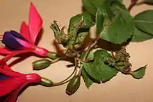 Aculops fuchsiae is host specific and the only eriophyid mite known to attack Fuchsia.[5] It feeds on the shoot tips, where it sucks sap.[2] It produces chemicals that interfere with the plant's normal growth, which instead becomes a distorted mass of reddish-pink or yellowish green tissue. There are several generations between late spring and autumn; the life cycle takes about 21 days at 18°C.[2] There are four life stages: egg, larva, nymph and adult. Eggs take between 4 and 7 days to hatch at 18°C, and females lay up to 50 eggs at one time.[5] The mite's cold tolerance is not known; it may remain active over winter if temperatures are high enough, though in cooler areas overwintering occurs beneath bud scales.[2] The Northwest Fuchsia Society states that mites in the Pacific Northwest of the USA may have been killed by −6 °C (21 °F) occurring over 3 to 4 nights, though outdoor mite populations in southern England appear to have survived winters with prolonged periods below 0 °C (32 °F).[5] Colonization of new Fuchsia plants occurs either by the mites being blown by wind or via hitching rides on insects and other animals travelling between plants.[2]