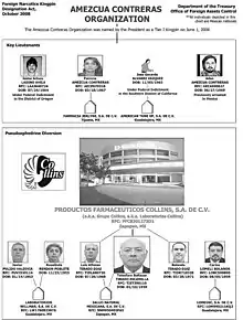 On October 2, 2008, the United States Department of the Treasury sanctioned Amezcua Contreras under the Foreign Narcotics Kingpin Designation Act (sometimes referred to simply as the "Kingpin Act"), for his involvement in drug trafficking along with nine other international criminals and six entities.[8] The act prohibited U.S. citizens and companies from doing any kind of business activity with him, and virtually froze all his assets in the U.S.[9]