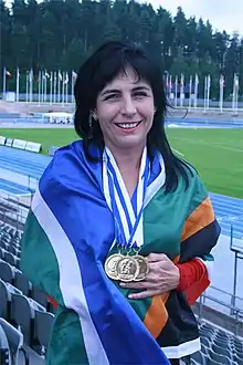 Booyens won her first international gold medal in France in 2008 in the masters 10 km walk event.[2] She became a South African National Masters Champion in the 5 km and 10 km events later that year and retained both titles in 2009.[3] In the 2009 World Masters Athletics Championships in Lahti, Finland she took 3 gold medals in the 5 km, 10 km and the team event on the 10 km race. She was nominated as one of the Best World Masters athletes for 2009.[4][5]
