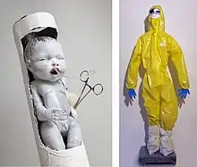 Heavy opposed intellectual worlds collide in her re-enacted stagings, fantasies mixed with realities which often illustrate the shattering truth. One example is Das Wunder von Puijang (en: The Wonder of Puijang) which shows an infant born while the mother was squatting over a toilet, who slipped into a waste tube and was saved.