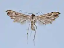 Adaina scalesiae is a moth of the family Pterophoridae that is endemic to the Galapagos Islands, where it was discovered by Bernard Landry on Bella Vista on April 1, 1992, and on May 25 of the same year on the island of Santa Cruz. The species was also found in Volcan Darwin, a province 15 kilometres (9.3 mi) from Puerto Villamil, on May 25, and 400 metres (1,300 ft) above sea level on Pinta Island where it was found from March 13 to 21. The species is attracted to various lamps including mercury-vapor lamps.[2]