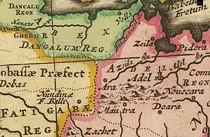 Adal was situated east of the province of Ifat and was a general term for a region inhabited by Muslims.[6][7] According to Portuguese explorer Francisco Alvarez, Adal in 1520 bordered on the Abyssinian frontier province of Fatagar in the west and stretched to Cape Guardafui in the east.[8] He further stated that it was confined by the kingdom of Afar in the north west and that the leaders of Adal were considered saints by the locals for their warfare with neighboring Abyssinia.[9]