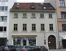 Due to the damages during the Second World War[1] and other changes, the Adalbertstraße shows a heterogeneous development. From the original two-storey buildings, only the house no. 14 from the period around 1827/30 has been preserved. The original buildings were replaced, starting in the 1860s, by mostly four-storey rental buildings and commercial buildings in the style of the Neo-Renaissance.