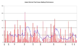 From the time of his debut up to the 2003 World Cup, Gilchrist's played in 40 Tests in series.[132] With the exception of the 2001 tour of India, when he averaged 24.80 (he made 124 runs in the series; 122 of them came in one innings), his performances with the bat were such that he was described at the time as the "finest batsman-wicketkeeper to have graced the game".[132][133] At one point in March 2002, Gilchrist's Test average was over 60; the second-highest for any established player in Test history,[134] and he topped the ICC Test batting rankings in May 2002.[135]