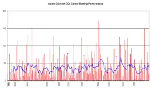 His strike rate is amongst the highest in the history of both ODI and Test cricket; his 57 ball century against England at Perth in December 2006 is the fourth-fastest century in all Test cricket.[5] He was the first player to have hit 100 sixes in Test cricket.[6] His 17 Test centuries and 16 in ODIs are both second only to Sangakkara by a wicket-keeper. He holds the unique record of scoring at least 50 runs in successive World Cup finals (in 1999, 2003 and 2007). His 149 off 104 balls against Sri Lanka in the 2007 World Cup final is rated one of the greatest World Cup innings of all time.[7][8] He is one of only three players to have won three World Cup titles.[9]