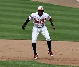 Adam Jones was born in San Diego, California on August 1, 1985, the son of Andrea, who raised Jones and his older brother alone until he was five. Growing up in San Diego, he was a San Diego Padres fan and was a huge fan of Tony Gwynn.[1] Jones excelled at both football and basketball and did not pick up a baseball bat until he was twelve. In 1997 his stepfather, Kenneth, took him to a Padres game after which he started to gain an interest in the sport. He picked up the sport very quickly and went on to star on his high school team. Jones graduated from Morse High School[2] in 2003 after leading his high school team as both a pitcher and a shortstop. During his senior season he batted .406, hit four home runs and batted in 27 runs. On the mound, Jones posted a record of three wins and three losses, while posting a 2.71 ERA.[2] At Morse, Jones was a teammate of future Baltimore Orioles teammate Quintin Berry.[3] Jones initially committed to play college baseball at San Diego State for head coach Tony Gwynn.[4]