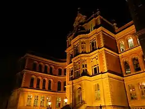 As it now exists, the Adams Building is the product of several distinct phases of construction from 1854 to around 1874.[2] The earliest phase is the building facing Stoney Street, with its elaborate symmetrical frontage behind a railed courtyard. It was designed as a lace showroom and warehouse, in which lace products brought in from outlying factories were finished off and then sold. The main display area seems to have been a two-storey lightwell in the centre of the building (now closed up), originally lit by decorative gas lamps; approached by a grand staircase. Secondary areas were used for mending and packing. The main power-source was a steam engine to the rear, with hydraulic engines for the hoists and packing machines.