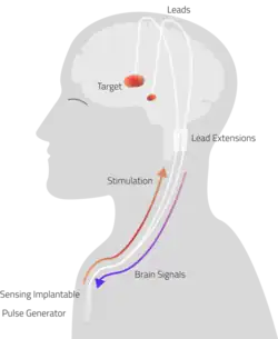 Conventional DBS delivers constant electrical stimulation to regions of the brain that control movement through a surgically implanted wire, or lead, that is connected to an implantable pulse generator (IPG). Programming adjustments to the pulse generator are frequently made by the treating neurologist based on what the patient is doing and the medication they take over time to optimize the patient’s symptoms.[2] However, it can lead to side effects.[3] Developed by Alberto Priori in 2005, aDBS is a specific type of closed-loop DBS and differs from conventional DBS systems (that provide constant stimulation) in that it can both sense the brain activity and deliver the appropriate stimulation in real time. This technology has been licensed and is developed by Newronika,[4][5]
