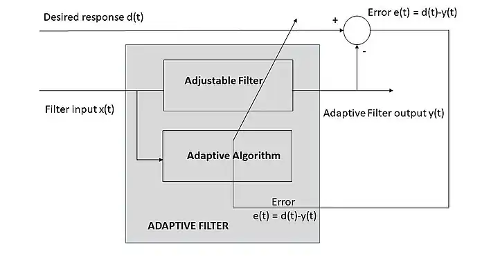 The power of the adaptive noise cancelling approach stems from the fact that the algorithm driving the iterative adjustment of weights in an adaptive filter is a simple fully automatic iterative process that relies only on ongoing sequence of sampling measurements of the noise canceller output and reference r(t) = nr(t). For example the LMS (Least Means Square) algorithm in the context of the usual tapped-delay-line digital adaptive filter leads to: