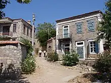 The buildings in the village have Greek and Turkish architecture.[7] The original houses in the village are made of stone, and have two stories in general. All houses have a courtyard and a garden. The village is surrounded by olive groves. In the 1980s, a group of people, who escaped the big city life, came to Adatepe, which was about to turn into a ghost town towards the end of the 1980s.[7] People from Ankara, İzmir and mostly from Istanbul purchased buildings, which could be regarded as ruined, and converted them into living spaces by keeping their traditional Greek and Turkish architecture.[7] Today, the newcomers and the locals live in harmony.[5][7] The total houses in the village number 380,[8] and Adatepe was declared in 1989 an urban protected area of first grade, being the only one with this status in the region.[3][5]