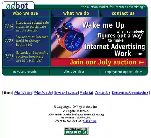 Adbot announced the introduction of its auction market for Internet advertising on Jan 23, 1997.[1] On April 10, 1997, the company held its first live outcry auction, pairing a number of small publishers with interested advertisers.[2] By mid-summer, Adbot was well on its way to selling more than 100 million placements and had completed a closed loop of ad delivery and publisher payments.[3][4]