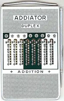 The Addiator is a mechanical add/subtract calculator, once made by Addiator Gesellschaft, Berlin. Variants of it were manufactured from 1920 until 1982. It is composed of sheet-metal sliders inside a metal envelope, manipulated by a stylus, with an innovative carry mechanism, doing subtract ten, carry one with a simple stylus movement. Some types of Addiators can also handle negative numbers (with a complementary bottom window or by providing a subtraction mode on the back side of the device).