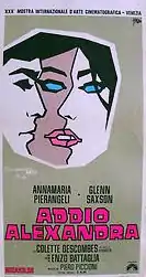 Addio Alexandra is an Italian romantic drama film, released in 1969. It stars Pier Angeli, Glenn Saxson and Colette Descombes.[1] The film premiered out of competition at the 30th Venice International Film Festival.[2]