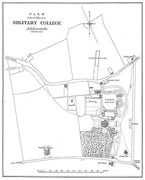 The initial purchase comprised the mansion house and 58 acres of land to the south of Lower Addiscombe Road, but a further 30 acres to the north were subsequently acquired.[5] New buildings were added, so that the mansion house, which originally housed the entire establishment, became a purely administrative block.[6] The additions included barracks, a chapel, a drawing and lecture hall, a hospital, a dining-hall, a sand-modelling hall, a gymnasium, and service facilities including a bakehouse, dairy, laundry, and brew-house.