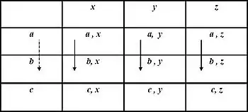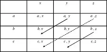 Consider two natural attributes A, and X. It is not known that either A or X is a continuous quantity, or that both of them are. Let a, b, and c represent three independent, identifiable levels of A; and let x, y and z represent three independent, identifiable levels of X. A third attribute, P, consists of the nine ordered pairs of levels of A and X. That is, (a, x), (b, y),..., (c, z) (see Figure 1). The quantification of A, X and P depends upon the behaviour of the relation holding upon the levels of P. These relations are presented as axioms in the theory of conjoint measurement.