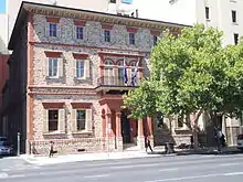 The club's headquarters are at the club house at 165 North Terrace in the city centre. The club house was built in the same year as the club's establishment in 1864,[7] after 14 prominent colonists, including John Baker, John Morphett and Arthur Blyth, raised £4000 for the building. The building was designed by one of the founding members, Edward Angus Hamilton, and the club adopted the grass tree as their crest.[8]