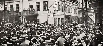 Adevărul's coverage of the international scene gave Romanians a window to political and cultural turmoil. By 1908, Adevărul was covering the burgeoning European avant-garde, offering mixed reviews to Futurism and deploring the supposed end of literary realism.[41] In late 1910, claiming to speak for "the democratic world", it celebrated the Portuguese republican revolt.[42] The efforts made for establishing and preserving international connections, Adevărul claimed, made it one of the first papers in the world to report some other events of continental importance: the 1911 food riots in Vienna, the outbreak of the First Balkan War, and the diplomatic conflict between the Greek and Bulgarian Kingdoms in the run-up to the Second Balkan War.[6] During the latter showdowns, Adevărul also employed several literary and political personalities as its correspondents: the paper's future manager Iacob Rosenthal in Sofia, Serbian journalist Pera Taletov in Belgrade, Romanian writer Argentina Monteoru in Istanbul, and Prince Albert Gjika in Cetinje.[6] In July 1913, the newspaper reported extensively on massacres committed by the Hellenic Army in Dojran, Kilkis and other settlements of Macedonia, while discussing the "terror regime" instituted in Bulgaria by Tsar Ferdinand I.[43] Later the same month, as Romania joined the anti-Bulgarian coalition and her troops entered Southern Dobruja, Adevărul gave coverage to the spread of cholera among soldiers, accusing the Conservative executive headed by Titu Maiorescu of hiding its actual toll.[44]