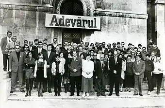 Edited after its resurgence by the pro-FSN poet and translator Darie Novăceanu,[23][114][119] Adevărul became the dominant left-wing newspaper of post-communist Romania. In parallel, Dimineața was itself revived, and, although independent from Adevărul, was also a FSN mouthpiece.[120] Their main right-wing rival was another former Communist Party venue, România Liberă, which openly reproached on the FSN that it was monopolizing power, and which identified itself with liberalism and pluralism.[121] Reflecting back on the early 1990s, Southampton Institute researcher David Berry argued: "the ideological forces associated with the previous Stalinist regime were pitted against a much smaller and disparate oppositional group. This latter group was associated with România Liberă that loosely represented the voice of liberalism and [...] clearly lost the war. This was a battle of ideas and the old forces of Romanian communism used the new press framework, through Adevărul, to discredit opposition forces."[122] In 1990, both papers reputedly sold around 1 million copies each day,[114][123] a pattern attributed to "news deprivation" under communism, and believed by Berry to be "a phenomenal figure in comparison to any leading Western nation".[124]
