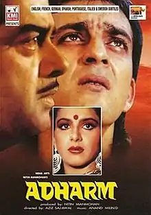 Adharm is a 1992 Bollywood drama film directed by Aziz Sejawal and produced by Nitin Manmohan. The film stars an ensemble cast. The story was written by Javed Siddiqui.[1][2]