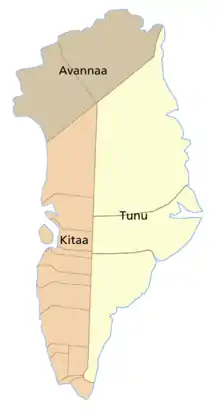 With the advent of Home Rule in 1979, these names were Greenlandicized to Kitaa, Tunu, and Avannaa. By 2008, Kitaa had 15 municipalities, Tunu 2, and Avannaa 1.