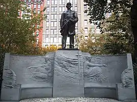 The statue, cast in 1880 and dedicated on May 25, 1881, is set on a Coopersburg, Pennsylvania black granite pedestal.[1] The work depicts Farragut, the noted United States Navy admiral of the Civil War, standing in naval uniform with binoculars and sword; the statue rests upon a plinth and then a pedestal, surrounded by a semicircular, winged exedra, which features a bas-relief figure of a seated female on either side.[1]