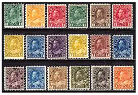 George V succeeded Edward VII as King of England and the British Dominions on 6 May 1910, however postage stamps bearing his image were not issued until late in 1911. The ensuing period, lasting until 1928, has become one of the most studied areas of Canadian philately which is somewhat unusual because only one basic stamp design was in use. There were several reasons for this, one of which was Canada's involvement in World War I from 1914 to 1918. This resulted in a scarcity of both engravers and the basic resources and materials needed to design and print postage stamps. Changes in currency exchange rates and international postal rates after World War One resulted in the Canadian Post Office issuing new denominations, as well as a change in the stamp's colors. The unusually long issuing period required new dies and several plates to be struck, resulting in a large range of flaws and other varieties for a stamp collector to study.[4][5] Philatelists have also studied the Admirals in great depth due to the large numbers of varieties of the stamps.[6]