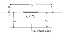 To take a look at a generalizable matrix, consider the figure of the two-node network. By Kirchhoff's Current Law, it can be shown that : since there are no other currents entering or exiting nodes or . The voltage drop across the line can be expressed as :. Next, use Ohm's Law with admittance instead of impedance. Using substitution to get :. To reintroduce some generality, and . Thus, this example can be taken as a first step in understanding how to generally construct an matrix by hand.