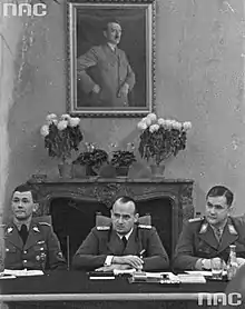 Up until 1938, the myth helped to convince most Germans that Hitler was a politician of conviction who was standing up for Germany's rights.[57] Before the start of World War II, the Führer myth was almost complete, but it was still missing an important trait: Hitler being a military genius.[58] Even before the start of the war, the Nazi propaganda machine was working towards portraying that image to the German people.[58] This was preceded by the myth of Hitler's diplomatic and foreign policy genius, which was spawned by his triumphs in the Remilitarization of the Rhineland, the Anschluss with Austria, being given the Sudetenland by the Western powers in Munich, and the bloodless invasion and partition of Czechoslovakia. By the lead-up to the Invasion of Poland, foreign minister Joachim von Ribbentrop was threatening to execute anyone on his staff who doubted Hitler's prediction that Poland would collapse in days and that England would not intervene on its behalf.[59]