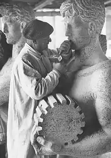 Although he was not in the first rank of officially approved sculptors, such as Breker and Josef Thorak, Wamper continued to receive state commissions until the end of the Nazi period. For example, he created two pairs of figures for the entrance to the Messe Berlin, Agriculture and Handwork and Industry and Commerce (removed in 1978) and reliefs for the Reichsgetreidestelle on Fehrbelliner Platz (destroyed). He also designed a monument in bronze of two warriors for the town of Ahlen, a terracotta relief of Hercules and Hydra for the naval hospital in Stralsund and a statue of Hölderlin for the Hölderlin Society in Tübingen. His Genius of Victory was included in the Great German Art Exhibition of 1940;[2][10] depicting a nude young man with upraised sword, an eagle at his feet,[3] it has been cited as an example of the fascist use of the male body as a symbol of Social Darwinist truth.[11] In 1941 he exhibited The Seasons, a group of four female figures. He was one of 23 sculptors listed in 1940 to work on the reshaping of Berlin under Albert Speer,[2] and in 1944 was placed on the Gottbegnadeten list of artists exempt from military service.[12] He was nonetheless called up in March 1945. (His studio and residence had both been destroyed by bombing and he and his wife had left Berlin for Heepen, now in Bielefeld.) A month later he was captured by U.S. forces and interned at the Golden Mile prisoner-of-war camp at Remagen. While there he used camp mud coated with linseed oil to create the Black Madonna of Remagen, which he gave to the priest in the Kripp section of the town; a facsimile now stands in the Black Madonna Chapel opened in 1987 to commemorate those who died in the camp.[3][13][14]