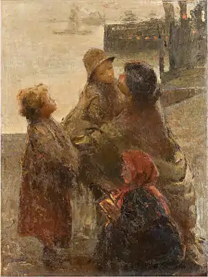 Orphan of father by the age of 16, Fergutti Visconti enrolled at the Brera Academy of Fine Arts when he was 18,[1] where he studied with Luigi Bisi, and made his debut in 1873 as a perspective painter. Attracted by the work of the Milanese Scapigliatura movement, he was one of the first members of the Famiglia Artistica. He completed his studies under the guidance of the history painter Stefano Ussi, which brought him into contact with the Tuscan art scene. On his return to Milan, he took part unfailingly in the major national exhibitions, attracting the attention of critics in 1881 with a work on a historical subject. It was in 1883 that he produced the first of his still lifes, which were to earn him a considerable reputation in the 1890s. A portrait of his in an outdoor setting won the prestigious Prince Umberto Prize in 1891, thus launching a renewal of the traditional approach to this genre through the influence of Cesare Tallone’s work and the first photographic models. The period between 1907 and 1909 saw a stay in Patagonia, where the artist painted canvases capturing various aspects of the life of the indigenous population. His tree Works Testa di indio della Terra del Fuoco, I funghi, Tordi are in the permanent collection of the Pinacoteca Cantonale Giovanni Züst in Rancate, while two other works, Uva nera and Ritratto di donna, are at the Museo Cantonale d'Arte of Lugano.[2]