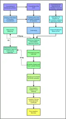 Adoption in the Philippines is a process of granting social, emotional and legal family and kinship membership to an individual from the Philippines, usually a child.[2] It involves a transfer of parental rights and obligations and provides family membership. The Department of Social Welfare and Development (DSWD) defines adoption as a "socio-legal process of giving a permanent family to a child whose parents have voluntarily or involuntarily given up their parental rights."