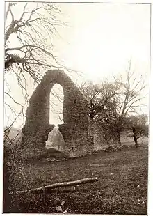 The Chapel was built of local Devonian sandstone and the bases of substantial buttresses can be seen at the west end. The west window was framed in a simple carved stone surround. The chapel probably dates from the middle of the 13th century or the beginning of the 14th century.