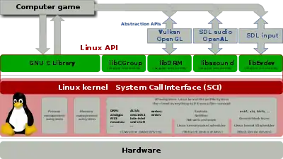 The Linux API is composed out of the System Call Interface of the Linux kernel, the GNU C Library (by GNU), libdrm, libalsa and libevdev (by freedesktop.org).
