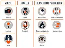 Adverse childhood experiences (ACEs) include childhood emotional, physical, or sexual abuse and household dysfunction during childhood. The categories are verbal abuse, physical abuse, contact sexual abuse, a battered mother, household substance abuse, household mental illness, incarcerated household members, and parental separation or divorce. The experiences chosen were based upon prior research that has shown to them to have significant negative health or social implications, and for which substantial efforts are being made in the public and private sector to reduce their frequency of occurrence.[1] Scientific evidence is mounting that such adverse childhood experiences (ACEs) have a profound long-term effect on health. Research shows that exposure to abuse and to serious forms of family dysfunction in the childhood family environment are likely to activate the stress response, thus potentially disrupting the developing nervous, immune, and metabolic systems of children.[2][3][4] ACEs are associated with lifelong physical and mental health problems that emerge in adolescence and persist into adulthood,[5] including cardiovascular disease, chronic obstructive pulmonary disease, autoimmune diseases, substance abuse, and depression.[6][7][8]