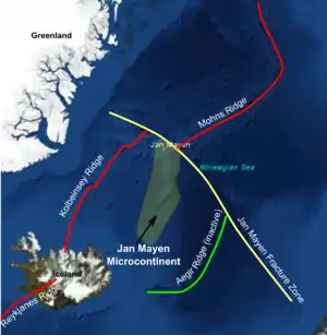 The Aegir Ridge is an extinct segment of the Mid-Atlantic Ridge in the far-northern Atlantic Ocean. It marks the initial break-up boundary between Greenland and Norway, along which seafloor spreading was initiated at the beginning of the Eocene epoch to form the northern Atlantic Ocean. Towards the end of the Eocene, the newly forming Kolbeinsey Ridge propagated northwards from Iceland, splitting the Jan Mayen Microcontinent away from the Greenland Plate. As the Kolbeinsey Ridge formed, so activity on the Aegir Ridge reduced, ceasing completely at the end of the Oligocene epoch when the Kolbeinsey Ridge reached the Jan Mayen Fracture Zone.[1]
