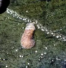 Reproduction is hermaphroditic. The eggs are large and are laid in a spiral string of mucous on the substrate. Development is direct, without any larval stage, the young crawling away after hatching. The juveniles have no cerata at first, and these develop as the animal grows. Reproduction seems to take place all year round, and the young reach maturity after several months of growth.[3]