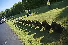 Large aerial saws are flown by helicopter to trim trees in remote locations when they overgrow power lines, pipelines or other infrastructure. A design used in the Appalachian region has ten circular saws on a twenty-foot shaft which is carried by an MD 500 helicopter, typically using a rigid boom of about 80 feet long on a gimbal mount, so that the saw can swing below the aircraft. The saw blades are powered by a 28-horsepower engine and the assembly weighs 830 pounds. This design is used to prune trees for customers such as American Electric Power. Another design, with a single, horizontal, 47-inch, circular saw blade, is used to cut the tops off trees which are at risk of falling across power lines.[1][2][3]