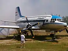 This Il-14 originally belonged to the 226th Independent Mixed Aviation Regiment, of the Southern Army Group of the Soviet Red Army. In 1981 it was withdrawn from service and stored for six years in Mirhorod (today in Ukraine), then in Tököl Airport, Hungary. In late 1987 it was flown to Ferihegy where it became the first plane of the newly founded aviation museum. Since then it was moved twice, in 1991 and in 2017, when the museum moved to a new place. Its total flight time is 5928 hours.[7] In 2009-2010 it has been restored. Originally it was only planned to be repainted in period Malév livery (while this specific plane has never been owned by Malév, the airline had Il-14 planes in its fleet), but since the plane was in a very good condition even after 25 years of disuse, repairs were done on both engines[8][9] and visitors can watch them being started once a month.