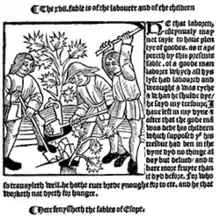 Some fables may express open scepticism, as in the story of the man marketing a statue of Hermes who boasted of its effectiveness. Asked why he was disposing of such an asset, the huckster explains that the god takes his time in granting favours while he himself needs immediate cash. In another example, a farmer whose mattock has been stolen goes to a temple to see if the culprit can be found by divination. On his arrival he hears an announcement asking for information about a robbery at the temple and concludes that a god who cannot look after his own must be useless.[104] But the contrary position, against reliance on religious ritual, was taken in fables like Hercules and the Wagoner that illustrate the proverb "god helps those who help themselves". The story was also to become a favourite centuries later in Protestant England, where one commentator took the extreme position that to neglect the necessity of self-help is "blasphemy" and that it is "a great sin for a man to fail in his trade or occupation by running often to prayers".[105]
