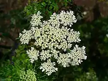 It has a fusiform root and a smooth hollow branched stem growing to about 80 cm (31 in) high, with much divided (ternately pinnate) smooth leaves with an unpleasant smell, and small compound umbels of small irregular white flowers.[2]
