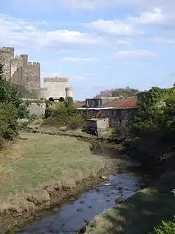 The first stage of the construction of Conwy town walls included digging ditches and erecting a palisade before the town was built, securing the area. This allowed a half-timbered mill on the Gyffin River to be built. The town walls were also connected to the walls of the castle, which were located on a rocky ground at the mouth of the Gyffin River to the Conwy riverbed. Conwy town access was also protected from the south by the river Gyffin which flowed into Conwy near the castle.[4][5]