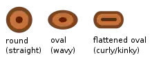 African-American hair comes in a range of textures, but the most common hair type is curly with lots of volume.[5] This curly quality is the product of the shape of the hair follicles.[5] More circular-shaped follicles cause hair to grow straighter, while more curly hair is caused by more elongated, oval-shaped hair follicles.[5] Hair follicles can also affect the thickness of hair strands.[5] African hair is seen to be much thicker and more dense meaning that the hair follicles are larger.[5] Density represents the amount of hairs that grow from the head, with denser hair resulting from more hairs growing closer together from the scalp.[5] An individual with high-density hair creates a fuller appearance of curls.