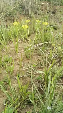Afrosciadium magalismontanum is a member of the carrot family, Apiaceae. It is a perennial tuberous herb native to subtropical regions in eastern South Africa and Eswatini.[2] It has a tall, narrow stem which divides into multiple evenly-spaced branches near the top, with each branch sporting a cluster of small yellow flowers at its end.