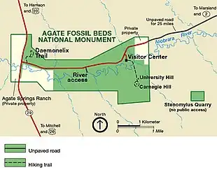 Agate Fossil Beds National Monument is a U.S. National Monument near Harrison, Nebraska. The main features of the monument are a valley of the Niobrara River and the fossils found on Carnegie Hill and University Hill.