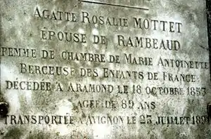 Agathe de Rambaud was born in Versailles as Agathe-Rosalie Mottet and was baptized in the future cathedral Saint-Louis of Versailles, on 10 December 1764.[1] She died in Aramon, in the département of Gard, on 19 October 1853.[2] She was the official nurse of the royal children, and particularly in charge of the Dauphin from 1785 to 1792.[3]